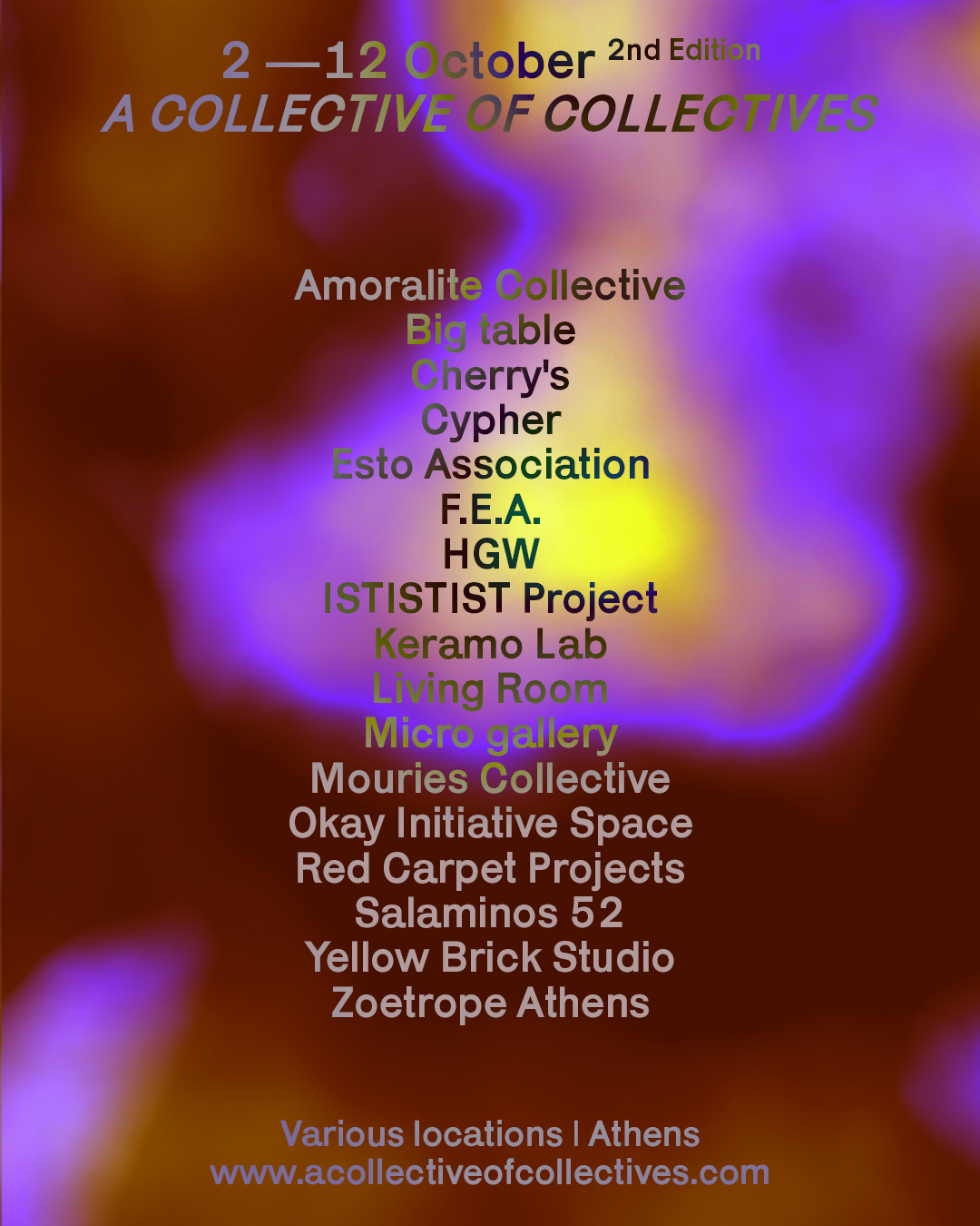 The Collective of Collectives Art Festival returns to Athens from 2–12 October 2025, bringing together the city’s independent, artist-run spaces for a two-week programme of exhibitions, workshops, screenings, and performances.