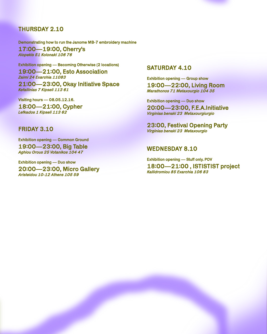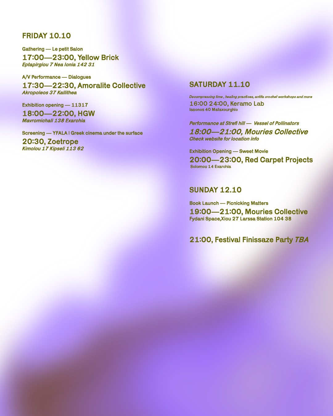 Self-organized, non-profit, and artist-led, the festival transforms Athens into a living map of underground and experimental culture. By moving from venue to venue, audiences are invited to discover the city’s vibrant network of self-funded initiatives and project spaces that drive its contemporary art scene.