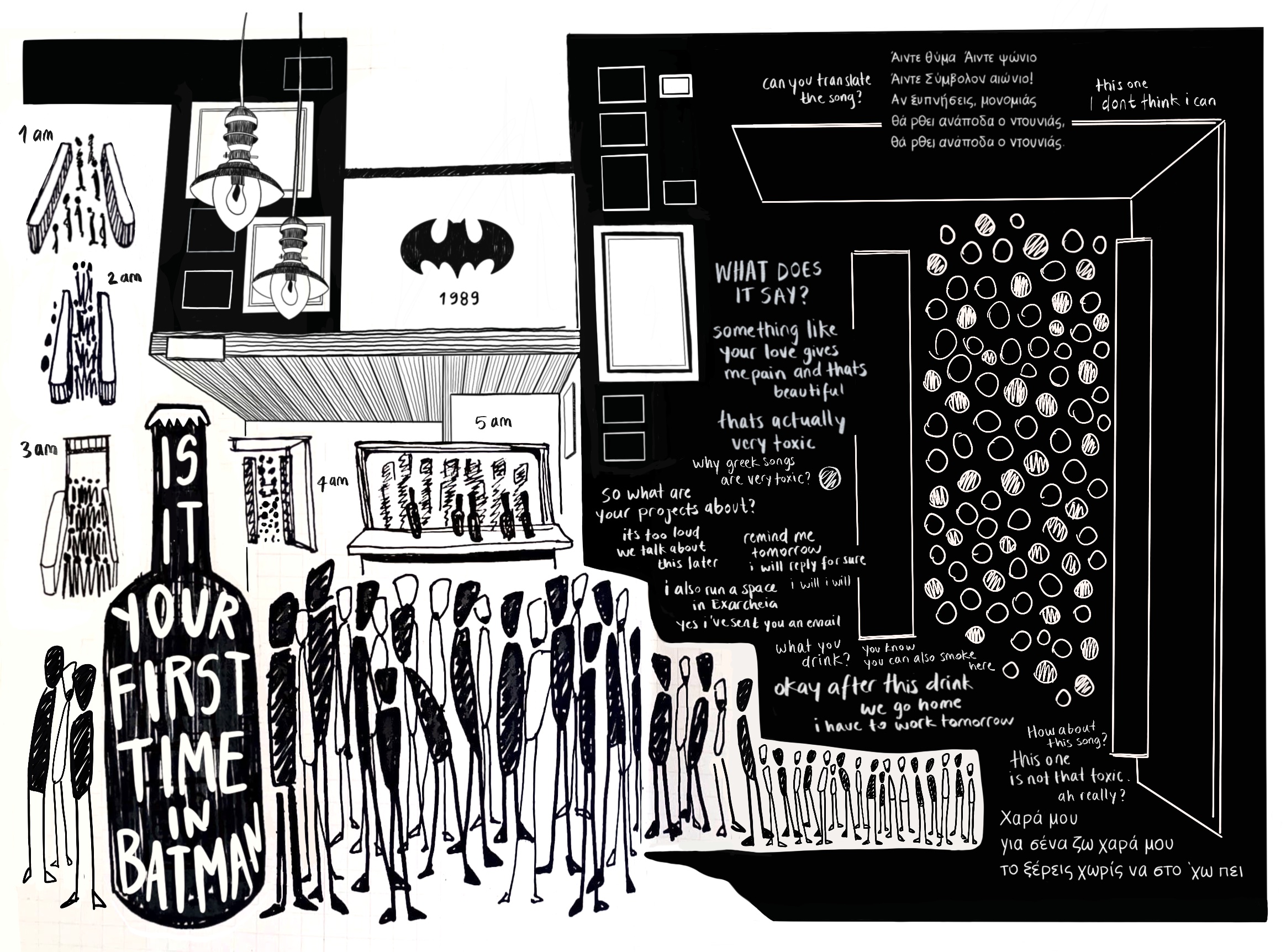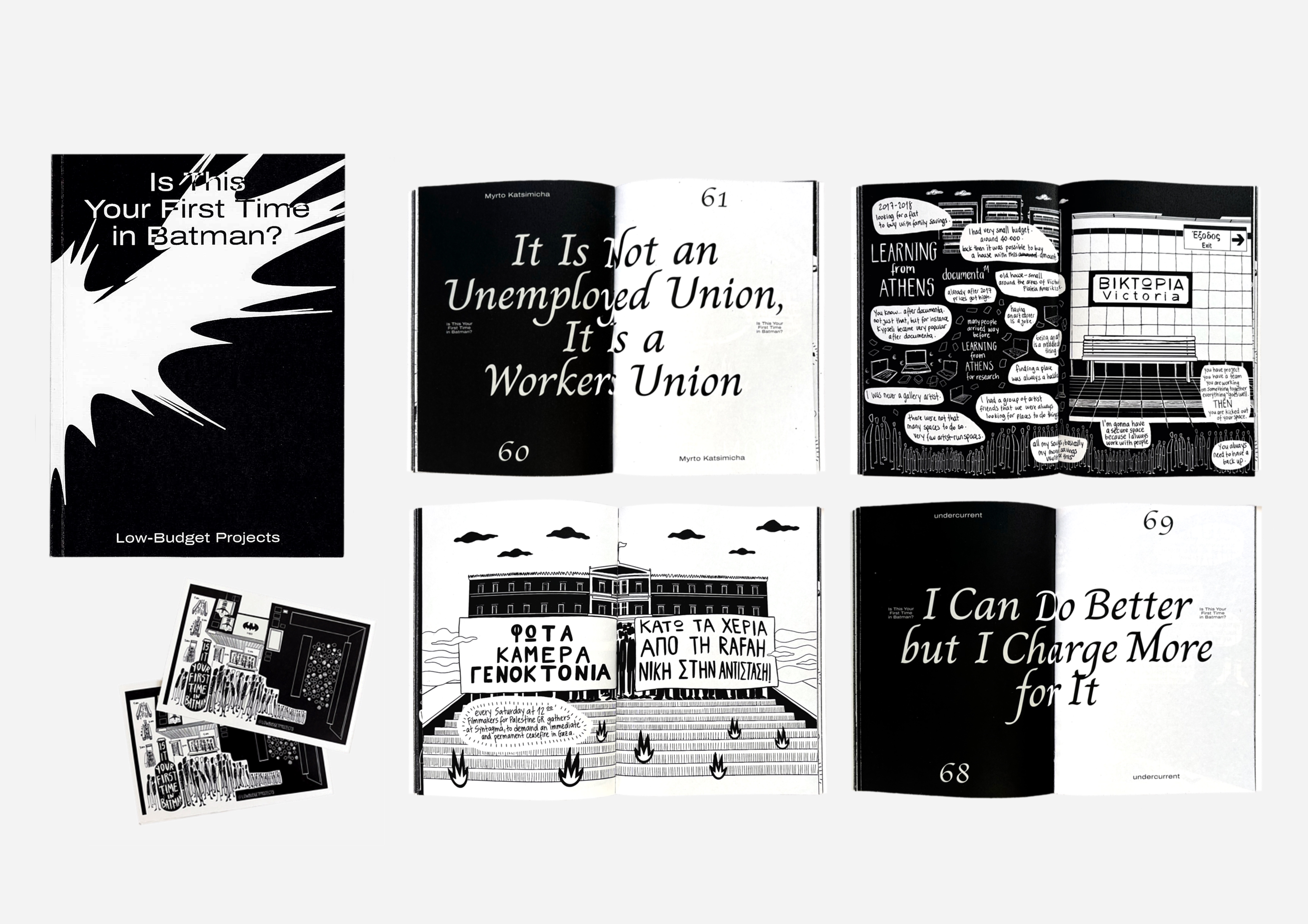 Is This Your First Time in Batman? is a following step of her ongoing research, Low-Budget Projects in Athens, which explores how art workers develop alternative survival economies and strategies for handling their crisis on a daily basis, while examining the capital flows and private institutions that shape cultural production. The project weaves and puts into circulation vulnerable narratives shared in environments of trust, following up organic routes shaped by her lived experience here. By working with text, drawings, and printed work, Gizem adds to her long-term commitment to investigating ways to defy precarious labour and its effects in the art and cultural field. By stimulating one-to-one exchange and collaborations beyond borders, she expands a growing network nurturing solidarity and complicity among peers. Low-Budget Projects is her present approach to spreading everyday survival tactics and resistances, departing from her views and experiences with precarity, migration, and feminism.